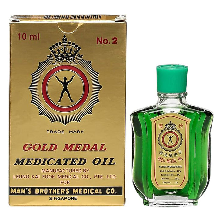 Specially prepared formula. Its unique ingredients provide relief from ailments such as blocked nose, rheumatic pains and stomach aches. For quick and refreshing relief from the heat of the day or an annoying headache, just apply Gold Medal Medicated Oil.