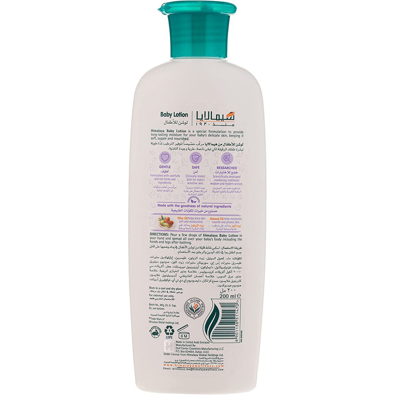 • Himalaya Baby lotion Nourishes, moisturizes, soothes baby’s skin. Enriched with Almond Oil and Olive oil, this quick absorbing daily use lotion nourishes and provides long-lasting moisture. Regular use keeps your baby's skin soft, supple and protected. Directions for use: Apply all over your baby's body after bath. Pediatricians advice: As your baby's skin is cleaned daily, it should be protected with a light and gentle baby lotion. Apply smoothly, without forgetting the neck and behind the ears. Almond oil provides long lasting moisture & protection to your baby’s delicate skin Olive Oil keeps skin soft, Antioxidants protects the skin and provides nourishment Fast-absorbing formula with rich emollients Significantly improves skin hydration, softness and smoothness"