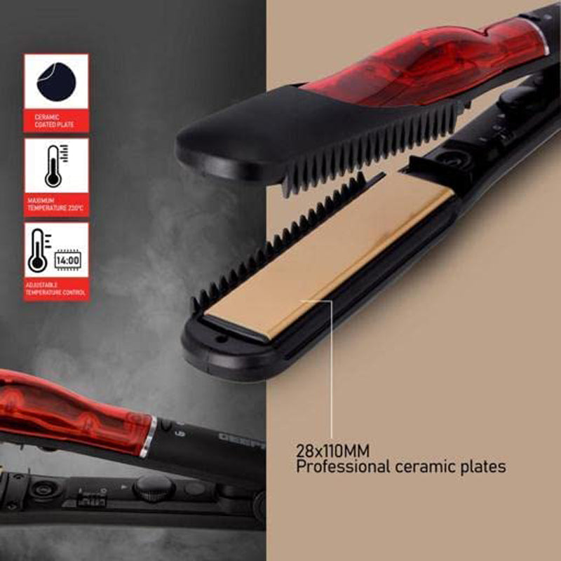 • The Geepas Pro230 - Stem Straightener is a professional grade straightener iron. This selection releases steam that penetrates into each individual shaft. Your hair will be smooth and shiny, without static electricity.The hair straightener is designed for high quality performance and long lasting durability to meet the demands of the modern hairstylist. An advanced steam ion generator works in conjunction with the ceramic plates to produce more ions for noticeably smoother and shinier results. The ceramic plates improves heat distribution and helps the selected temperature remain even throughout the entire plate, so that fewer passes are needed through your precious hair. That's the best way to get silky results that shine while protecting your hair cuticles from overheat exposure. Besides, the plates heat up in seconds, so you don't have to lose any time while adjusting the temperature setting via the digital display between up to 230C suit your particular hair type and texture. The flat iron's floating plates have curved edges that provide extra flexibility to straighten, curl or flip your hair.The water tank of large capacity can be easily filled with water care, help add moisture and gloss to hair and prevent damage. Style comfortably at any angle with the 360 swivel cord. Worldwide voltage (220 - 240V AC) will automatically adjust to the proper voltage in your journey, what you need just a correct adaptor. It is also an ideal gift choice for your family and yourself, suit for beautiful ladies, young girls and elegant women. "