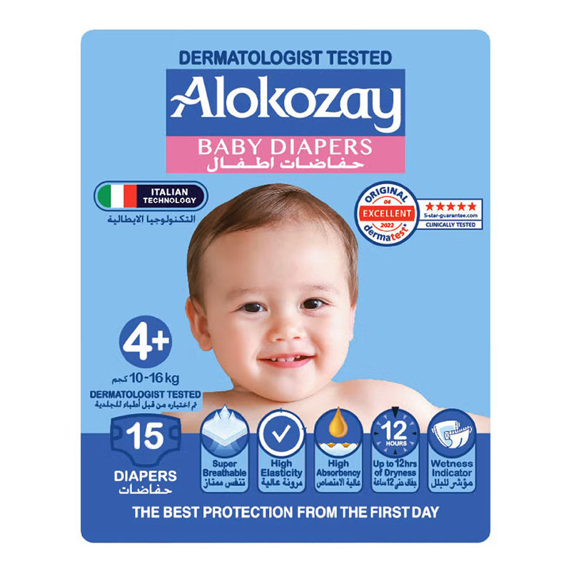 Alokozay Premium Baby Diapers - Size 4+ (10-16 Kg) Suitable for Sensitive Skin- 15 Diapers