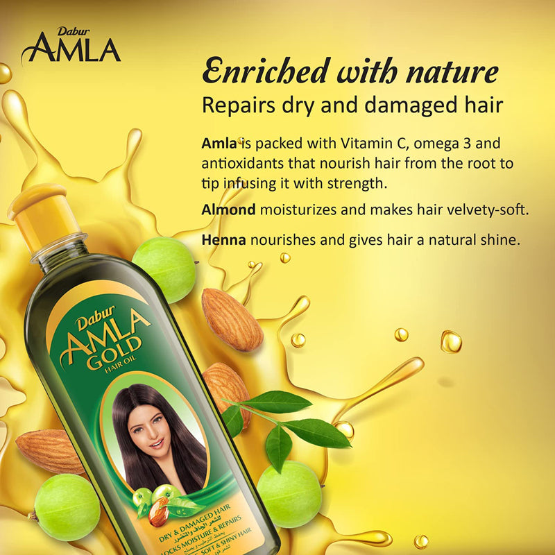• Dabur amla gold has a unique, natural & lightweight formula is enriched with amla, almond & henna It nourishes, moisturizes & shields hair from dryness giving you strong, soft & shiny hair Amla nourishes hair from root to tip to make it strong Almond, moisturizes & makes hair soft Henna, nourishes & makes hair shiny"
