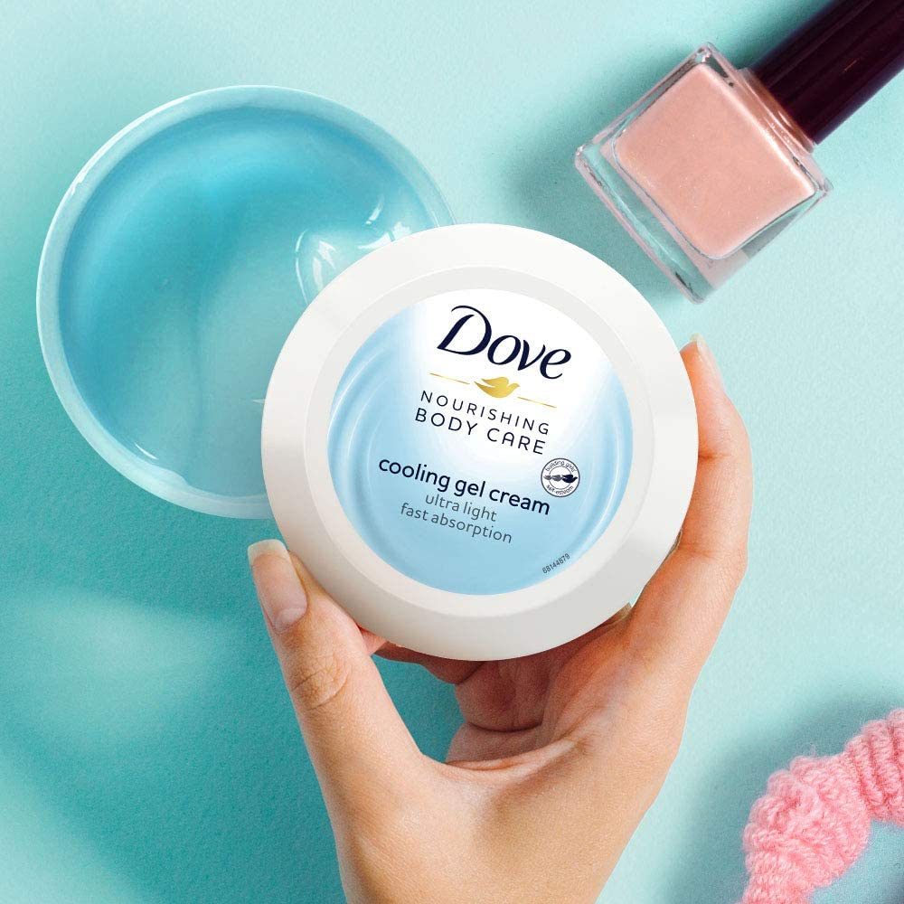 • Dove Nourishing Body Care Cooling Gel Cream refreshes dry skin Made with NutriDUO moisturising complex for extra smooth skin nourishment Lightweight gel with a water blossom fragrance gives a burst of hydration with a cooling effect Silky Dove body cream gives you up to 24-hour moisturisation for smooth skin This cooling gel 24 hour moisturiser is dermatologically tested and suitable for all skin types."