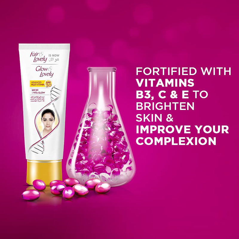 • This face cream with SPF 30 and pollution protect formula protects your skin in the sun while its multivitamins enhances your glow. The Glow & Lovely Advanced multivitamin cream with SPF 30 + Vita Glow gives your skin a natural glow, reduces tan and skin dullness, has up to SPF 30 Sun protection and helps protect against sunburn. This brightening cream has 30 times longer sun protection so that you can have fun in the sun, without worrying about getting tanned! Protects against hyperpigmentation caused by sun damage. Get glowing skin with UV protection that protects against hyperpigmentation and enhances even skin tone. The face cream protects you from harmful sun rays which causes Sun Tan, Sun Spots and Sun burn It's matte texture leaves your face feeling non-oily and bright through the day! Get glowing skin that lasts all day."