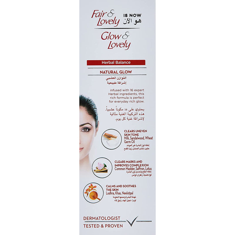 • Infused with 16 expert Herbal ingredients, this rich formula is perfect for everyday rich glowing skin. The Glow & Lovely Herbal Balance Face cream clears uneven skin tone with ingredients such as Milk, Sandalwood, Wheat Germ Oil The Glow & Lovely Herbal Balance Face cream CLEARS MARKS AND IMPROVES COMPLEXION with ingredient such as Common Madder, Saffron, Lotus Assists in hyperpigmentation. The Glow & Lovely Herbal Balance Face cream CALMS AND SOOTHES THE SKIN with these ingredients, Lodhra, Khas, Neelotpal. Helps even skin tone. DERMATOLOGIST TESTED & PROVEN and suitable for all skin types. Best used after Glow & Lovely Face wash to optimize brighter skin reducing dark spot It is recommended that Glow & Lovely Advanced Multi Vitamin cream be used twice daily – once in morning and once in evening after cleansing your face for glowing skin."